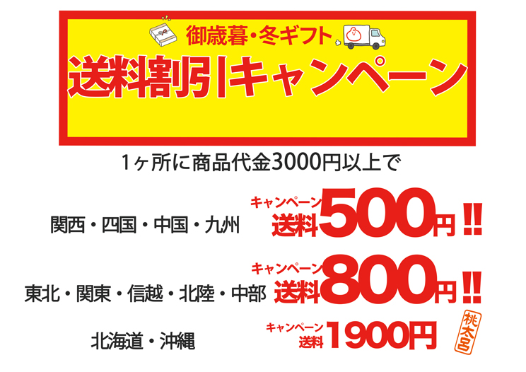 【送料割引キャンペーン】1月5日までにご注文受付分! 2025年11月08日 送料サービスキャンペーン! 御歳暮・冬ギフトに! 1カ所ごとに商品代金3000円以上でキャンペーン送料になります。 桃太呂全店舗11月15日~1月4日の期間中にご注文受付分がキャンペーン適応となります! 大切な方への贈り物、自分へのご褒美に ぜひこの機会にご注文ください♪ 次» お知らせ